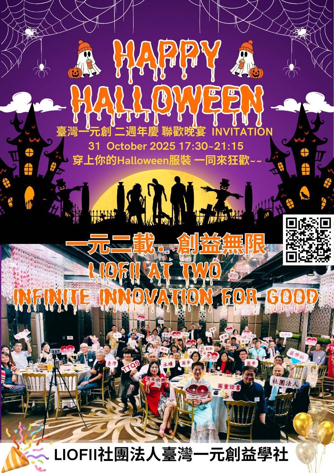 2025年10月31日晚間,社團法人臺灣一元創益學社(LIOFII)於台北舉辦「二週年慶暨萬聖節聯歡晚宴」,以「一元二載・創益無限」為主題。現場星光閃耀、氣氛熱烈,嘉賓盛裝出席,在萬聖節的節慶氛圍中展現永續創新與公益精神的完美融合。
