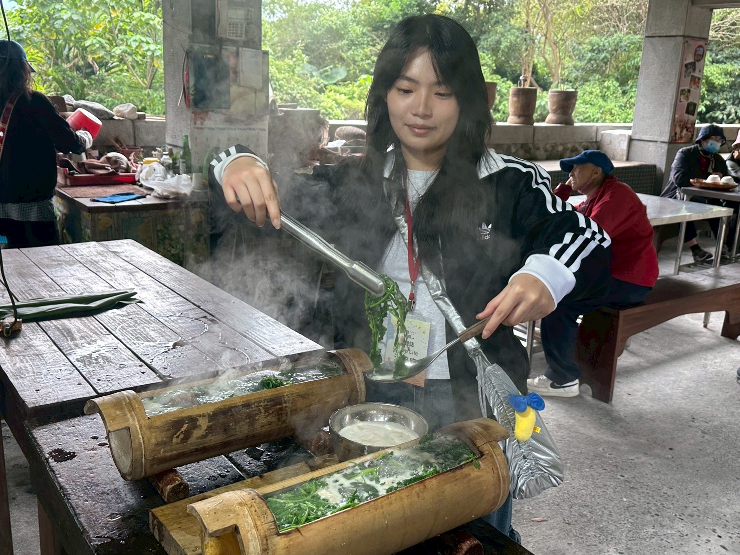 午餐體驗「石頭火鍋」,將燒得滾熱的蛇紋石投入竹筒中煮湯,香氣瞬間散開,讓大家不只吃到食材,也吃進山林中的自然風味。