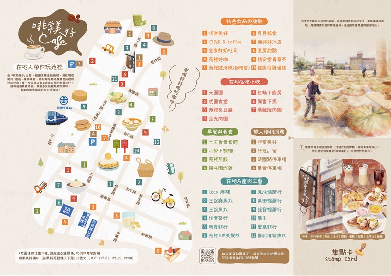 「啡常美好」營運長陳小姐表示,地圖設計初衷是希望能讓遊客以咖啡館為起點,帶領大家深入探索苑裡的街頭巷尾。地圖內容詳盡,涵蓋了苑東里的核心鬧區,並延伸至舊社里、田心里、水坡里、社苓里、山腳里、山柑里、蕉埔里、石鎮里、南勢里及客庄里等區域,將苑裡的自然景觀與人文工藝一網打盡。