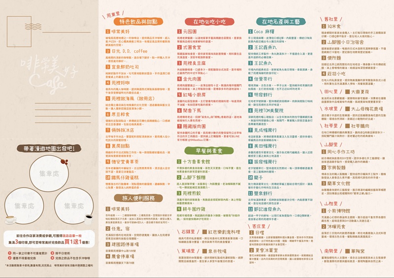 為鼓勵民眾親自走訪在地特約店家,地圖特別設計「集章處」。遊客只要帶著地圖前往合作店家消費或參觀,集滿三個不同店家的印章,即可回到「啡常美好」咖啡館,享受飲品買一送一的專屬優惠(限平日使用,兌換詳情依現場公告為準)。