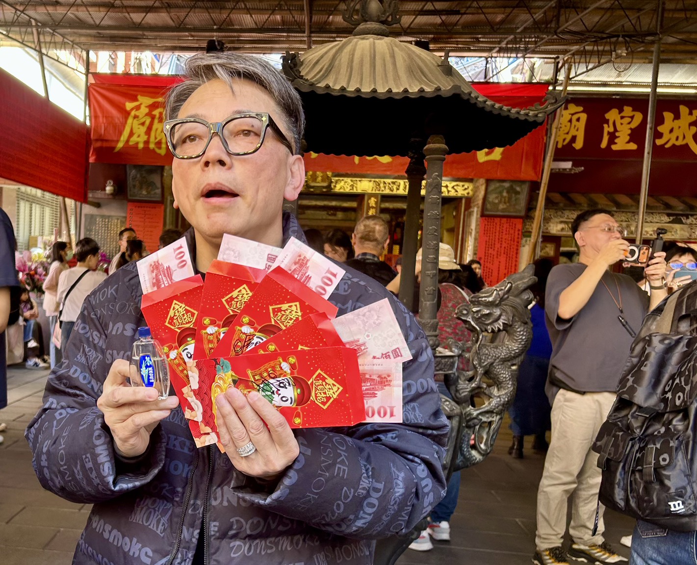 現場詹老師: (現場示範)「發財油可點身上!可塗在手掌心或點在在紅包上,等一下發紅包給民眾,這叫『財氣傳承』,把好運直接過給領紅包的人!」於紅包點上「發財油」,象徵透過精油香氣轉動財富磁場,讓求姻緣的民眾也能「香」氣襲人、財源廣進。