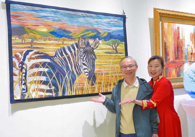 藝術家殷麗慧與先生林偉彬於其拼布作品「美好世界」前合影。攝於2025年藝術夢想家中正紀念堂聯展。(照片提供:藝術家殷麗慧/提供)