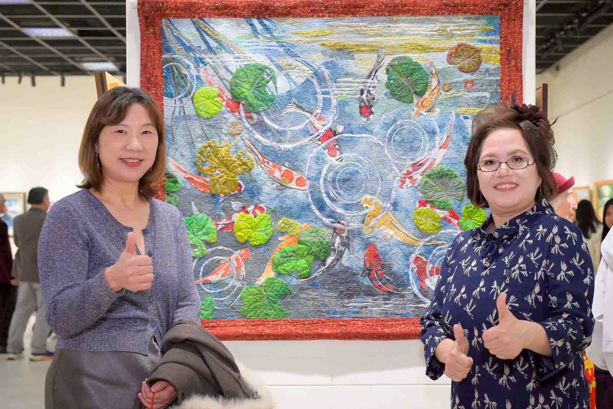 藝術夢想家現任理事長呂秋月女士(右),與藝術家殷麗慧及其拼布作品「生命力」合影。攝於2026年藝術夢想家中正紀念堂聯展。(照片提供:藝術家殷麗慧/提供)