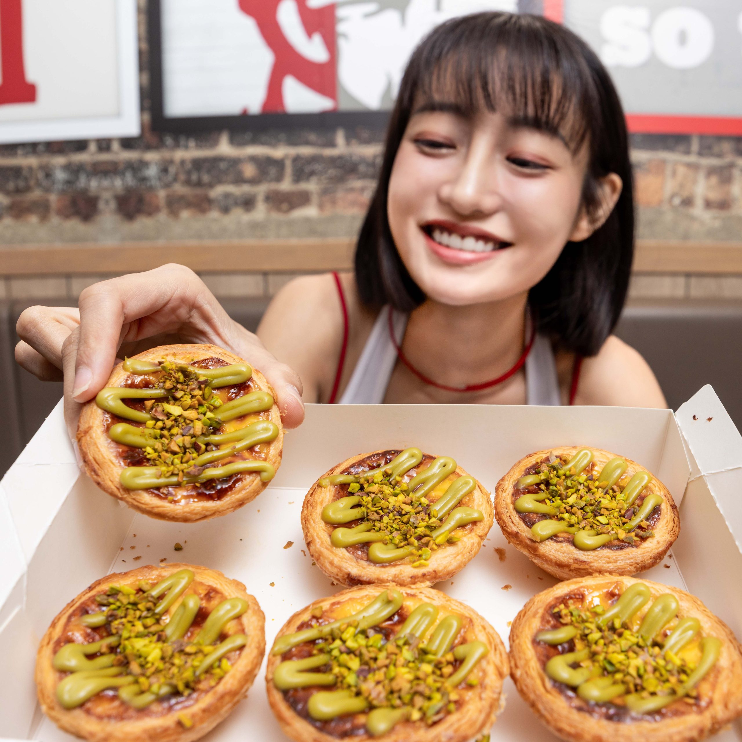 這是完勝開心果控的美味之秘。台灣限定版「開心果脆粒蛋撻」特別於頂層覆蓋上一層如雲朵般輕盈的開心果慕斯,質地綿密、香氣清新不膩。細緻綿密的口感完美平衡了流心的濃郁,賦予整體蛋撻更精緻的層次感。